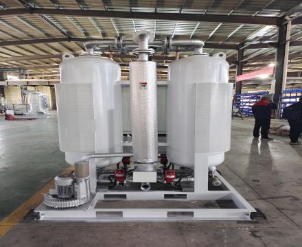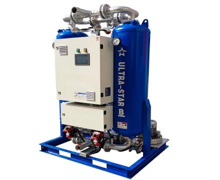 工作原理:鼓風再生吸附式干燥機的吸附基本原理與傳統吸附工藝類似。但其再生方法是鼓風再生的工藝,工藝步驟包括加熱、吹冷。加熱時再生氣源來自鼓風機升壓后的環境空氣,經加熱器加熱至再生溫度作為吸附器床層解析的再生氣體。在再生操作時,再生加熱氣體對吸附床層進行加溫解析,并由再生氣體攜帶析出的水蒸氣,并帶出吸附器。再生吹冷或取自自身干燥空氣,經減壓后作為再生吹冷氣體,或進行空氣循環冷卻分離作為再生吹冷氣體,對床層進行吹冷,以滿足下一階段吸附工作需要,避免空氣出口露點由于存在床溫而出現不穩定情形。